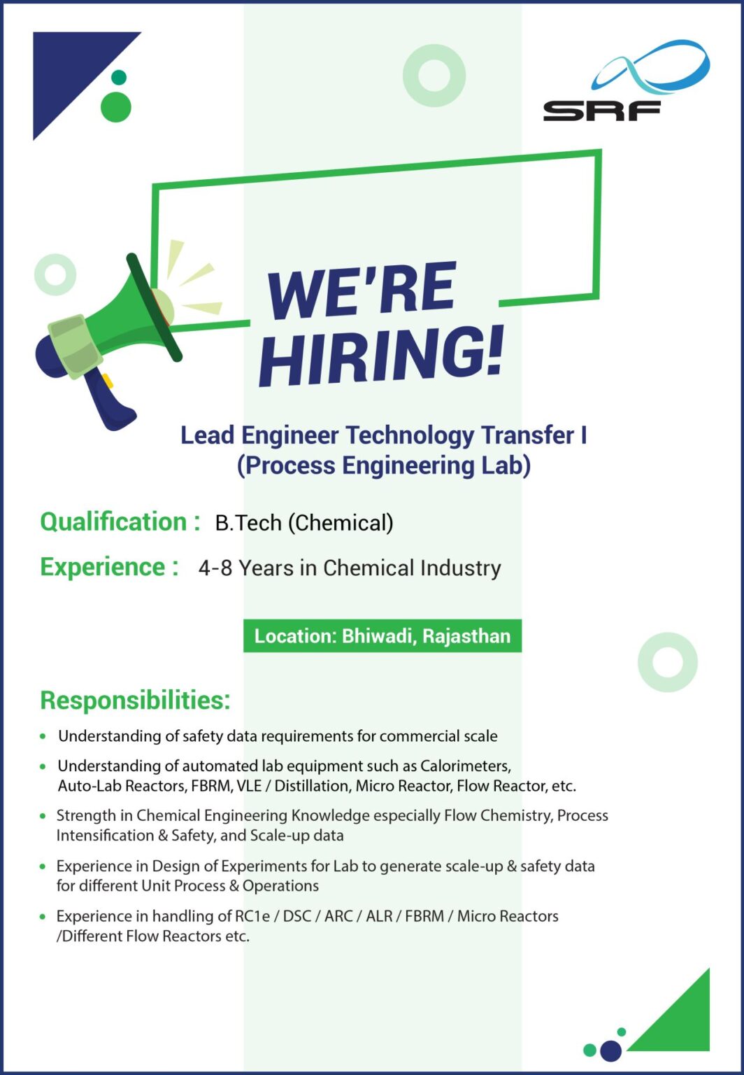 Openings for Lead Engineer Technology Transfer ( Process Engineering Lab ) At SRF LIMITED